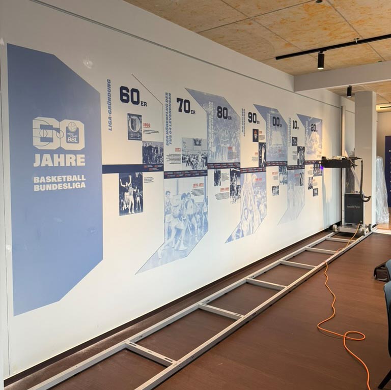 Im Rahmen dieses Projekts wurde anlässlich des 60-jährigen Jubiläums der easyCredit Basketball Bundesliga eine großformatige Wandgestaltung umgesetzt. Der Wanddruck wurde vor Ort realisiert und dauerhaft in den Innenraum integriert.